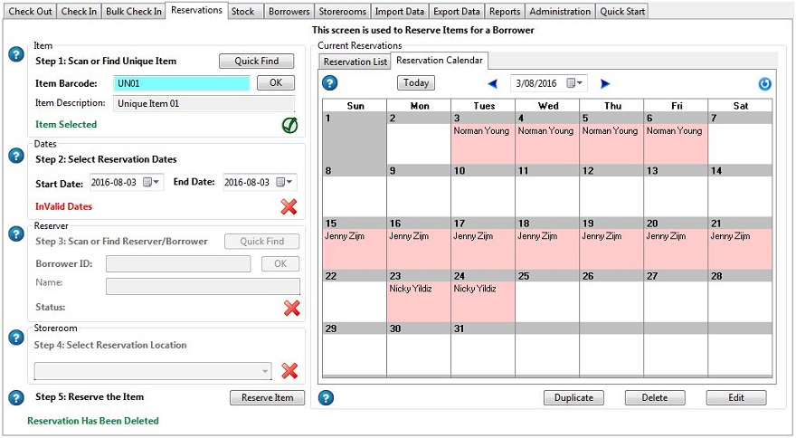 To reserve items, select the item(s), the dates to reserve, the borrower and the storeroom.